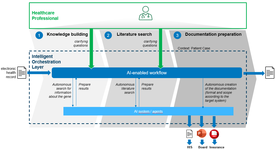 First, the physician seeks to understand the initial situation based on the molecular analysis. AI primarily acts as an assistant by displaying relevant content (images, descriptions etc.) from various data sources. At the same time, AI builds contextual knowledge, which becomes relevant in the second step, where the literature search is carried out autonomously.